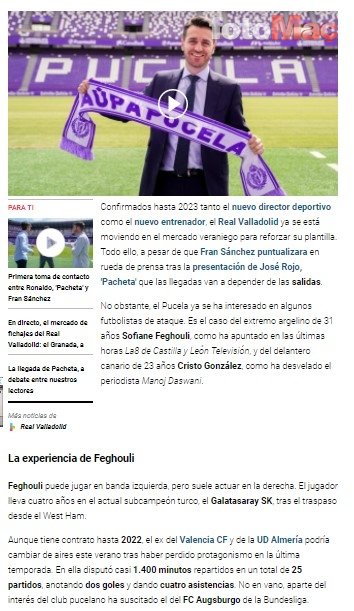 Castilla y León Televisión’dan La8’in aktardığı bilgilere nazaran ve gazeteci Manoj Daswani’nin istihbaratı doğrultusunda İspanyol grubunun, Galatasaraylı Sofiane Feghouli için resmi teklif yapacağı kaydedildi.