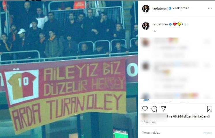 Galatasaraylı futbolcu Arda Turan, toplumsal medya hesabından sarı-kırmızılılar için paylaşımda bulundu. Paylaşılan fotoğraf karesinde yer alan pankartta, ‘Aileyiz Biz, Düzelir Her şey, Arda Turan Oley’ tabirleri yer alırken, Turan bu paylaşımı sarı-kırmızı kalplerle yaptı.