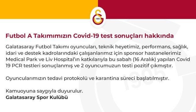 Galatasaray Futbol Grubu oyuncuları, teknik heyetimiz, performans, sıhhat, idari ve takviye takımlarındaki çalışanlarımız için sponsor hastanelerimiz Medical Park ve Liv Hospital’ın katkılarıyla bu sabah (16 Aralık) yapılan Covid 19 PCR testleri sonuçlanmış ve 2 oyuncumuzun testi olumlu çıkmıştır. Oyuncularımızın tedavi protokolü ve karantina süreci başlatılmıştır.