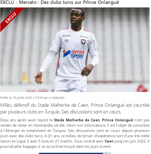 Le10sport’ta yer alan ve Fotomaç’ın derlediği habere nazaran, Caen’de kalmak istemeyen Oniangue için Türkiye’den birden fazla kadronun devrede olduğu belirtildi. Deneyimli futbolcunun da bu doğrultuda Türk kulüpleriyle görüşmelere başladığı aktarıldı.