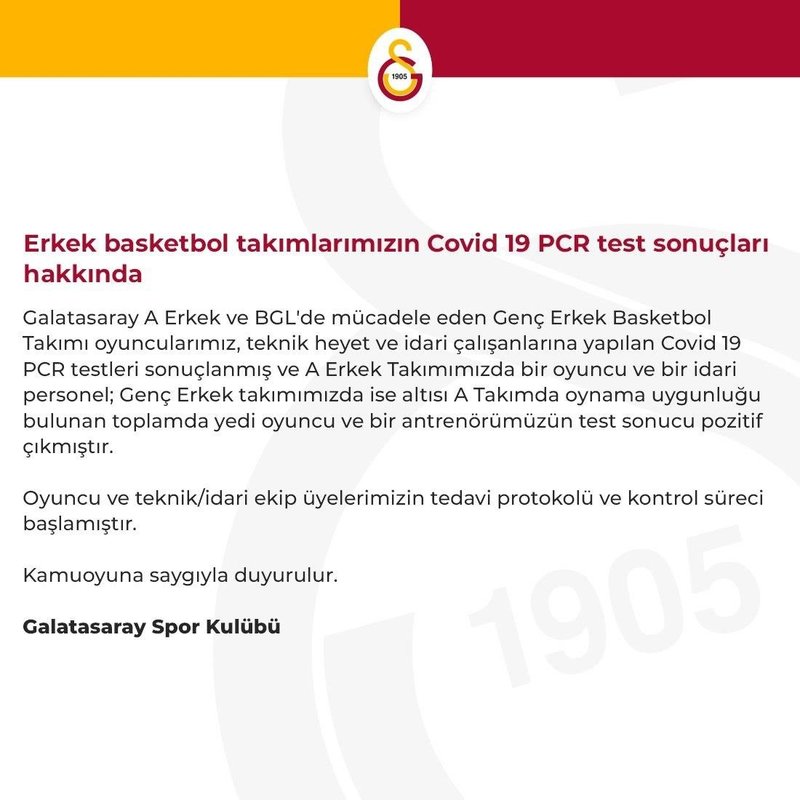 Galatasaray resmi internet sitesinden yaptığı açıklamayla, erkek basketbol ekiplerine yapılan yeni tip corona virüsü (Covid-19) test sonuçlarını paylaştı.