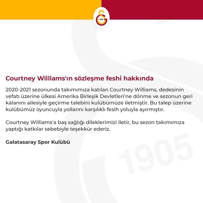 “2020-2021 döneminde kadromuza katılan Courtney Williams, dedesinin vefatı üzerine ülkesi Amerika Birleşik Devletleri’ne dönme ve dönemin geri kalanını ailesiyle geçirme talebini kulübümüze iletmiştir. Bu talep üzerine kulübümüz oyuncuyla yollarını karşılıklı fesih yoluyla ayırmıştır. Courtney Williams’a başsağlığı dileklerimizi iletir, bu dönem ekibimize yaptığı katkılar sebebiyle teşekkür ederiz.”