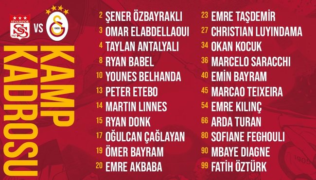 Muhteşem Lig’in 8. haftasında Sivasspor’la deplasmanda karşılaşacak Galatasaray’ın kamp takımı belirli oldu. Sarı-kırmızılılarda sakatlığı bulunan Radamel Falcao kafilede yer almazken, Younes Belhanda, Marcao ve Marcelo Saracchi ise takıma dahil edildi.