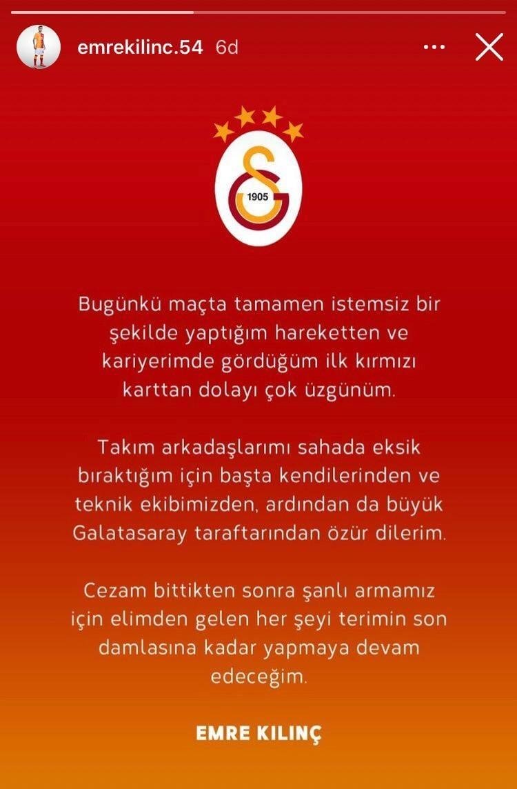 Emre Kılınç, toplumsal medya hesabından yaptığı açıklamada, “Bugünkü maçta büsbütün istemsiz bir biçimde yaptığım hareketten ve mesleğimde gördüğüm birinci kırmızı karttan ötürü çok üzgünüm. Ekip arkadaşlarımı alanda eksik bıraktığım için başta kendilerinden ve teknik takımımızdan, akabinde da büyük Galatasaray taraftarından özür dilerim.” tabirlerine yer verdi.