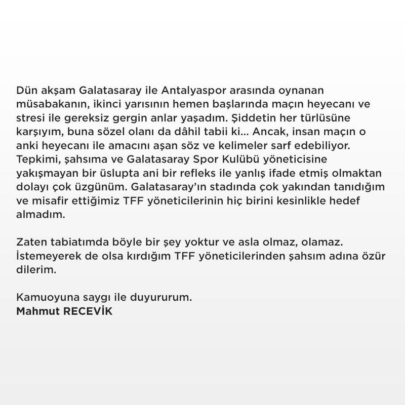 Mahmut Recevik’in yaptığı yazılı açıklama şu halde: “Dün akşam Galatasaray ile Antalyaspor ortasında oynanan karşılaşmanın ikinci yarısının çabucak başlarında maçın heyecanı ve gerilimi ile gereksiz gergin anlar yaşadım. Şiddetin her türlüsüne karşıyım, buna sözel olanı da dahil natürel ki… Lakin insan maçın o anki heyecanı ile gayesini aşan kelam ve sözler sarf edebiliyor. Reaksiyonumu, şahsıma ve Galatasaray Spor Kulübü yöneticisine yakışmayan bir üslupta ani bir refleks ile yanlış söz etmiş olmaktan ötürü çok üzgünüm. Galatasaray’ın stadında çok yakından tanıdığım ve konuk ettiğimiz TFF yöneticilerinin hiçbirini muhakkak amaç almadım. Zati tabiatımda bu türlü bir şey yoktur ve asla olmaz, olamaz. İstemeyerek de olsa kırdığım TFF yöneticilerinden şahsım ismine özür dilerim.”