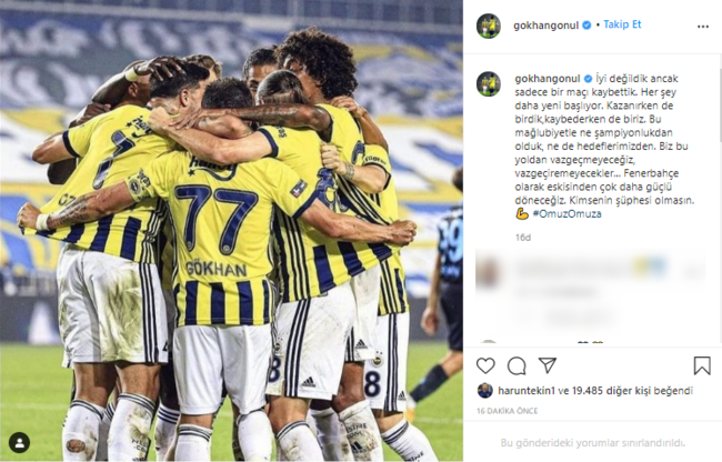 “İyi değildik fakat yalnızca bir maç kaybettik. Her şey daha yeni başlıyor. Kazanırken de birdik, kaybederken de biriz. Bu yenilgiyle ne şampiyonluktan olduk, ne de gayelerimizden. Biz bu yoldan vazgeçmeyeceğiz, vazgeçiremeyecekler… Fenerbahçe olarak eskisinden çok daha güçlü döneceğiz. Kimsenin kuşkusu olmasın. Omuz omuza”