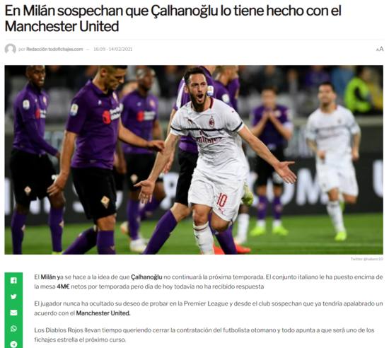 Haberde, “Hakan Çalhanoğlu, Premier Lig’de oynama dileğini asla gizlemedi ve Milan yetkilileri de yıldız ismin Manchester United’la kelamlı mutabakata vardığından şüpheleniyor” denildi.