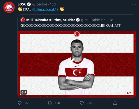 A Ulusal Futbol Kadromuz, 2022 Dünya Kupası Elemeleri’nde Hollanda ile karşılaştı. Ulusallar Burak Yılmaz’ın attığı 2 golle birinci yarıda 2-0 öne geçerken, Fransız kulübü Lille, Burak Yılmaz’ı tebrik etti.