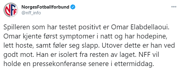 Norveç Futbol Federasyonu, Galatasaray’da forma verildi Omar Elabdellaoui’nin test sonucunun müspet çıktığını açıkladı. Twitter’dan yapılan paylaşımda; “Omar dün gece birinci semptomları, baş ağrısı, öksürük ve halsizlik vardı. Şu an durumu iyi ve grubun kalanından izole edildi.” denildi.
