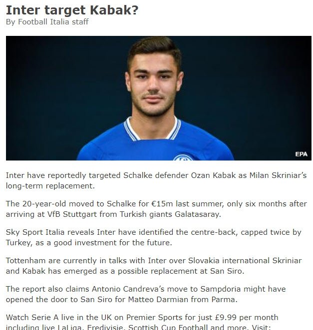 İtalyan basınında yer alan bilgilere göre şu anda Tottenham ile görüşen Skriniar’ın ayrılığı dahilinde Inter, Ozan Kabak için Schalke 04’e resmi teklif yapacak.