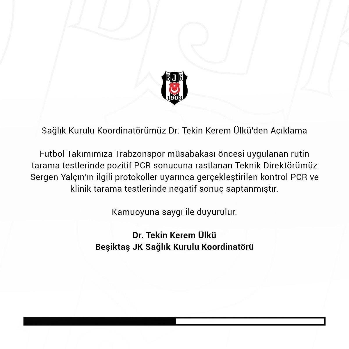 Son dakika haberi… Beşiktaş, teknik direktör Sergen Yalçın’ın yeni tip corona virüsü (Covid-19) testinin negatif çıktığını açıkladı.