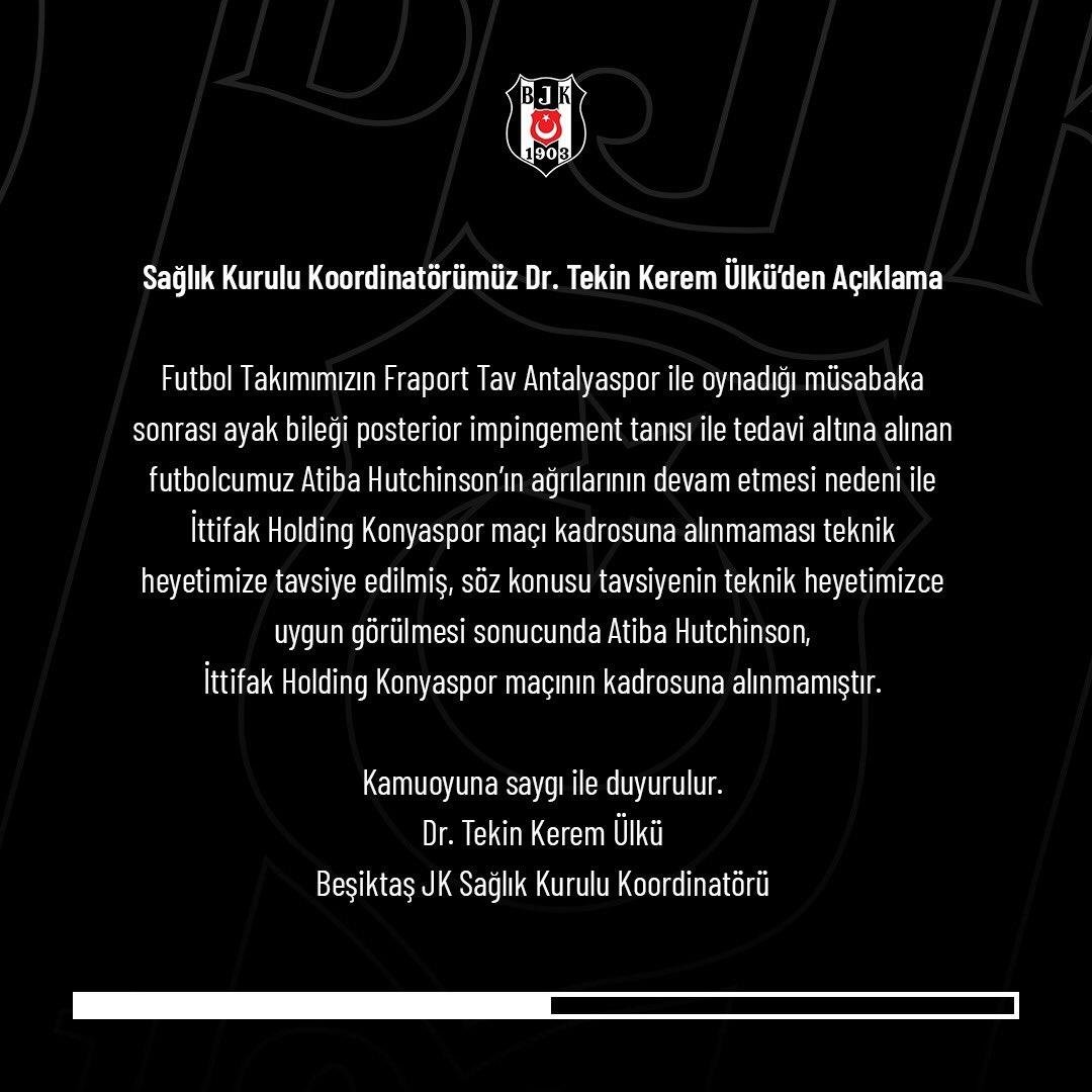 “Futbol Ekibimizin Fraport Tav Antalyaspor ile oynadığı karşılaşma sonrası ayak bileği posterior impingement tanısı ile tedavi altına alınan futbolcumuz Atiba Hutchinson’ın ağrılarının devam etmesi nedeni ile İttifak Holding Konyaspor maçı takımına alınmaması teknik heyetimize tavsiye edilmiş, kelam konusu tavsiyenin teknik heyetimizce uygun görülmesi sonucunda Atiba Hutchinson, İttifak Holding Konyaspor maçının takımına alınmamıştır”