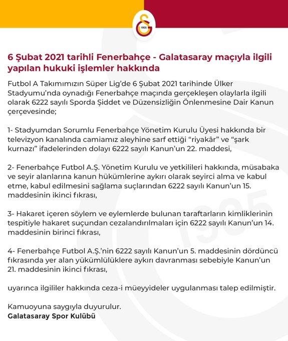 Galatasaray, Spor Toto Harika Lig’in 24. haftasında oynanan Fenerbahçe derbisiyle ilgili flaş bir açıklama yayınladı.