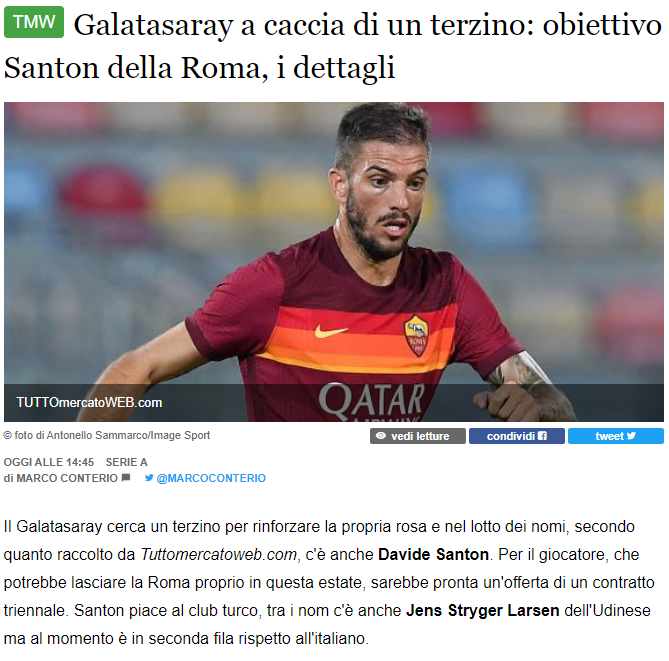 Tuttomercato’nun haberine nazaran rotayı İtalya’ya çeviren Aslan, Davide Santon’u gündemine aldı. Takımını güçlendirmek için bir bek arayan Aslan’ın birçok ismi gündemine aldığı belirtilen haberde bu isimlerden birinin de Santon olduğu söylendi. Sarı kırmızılıların, bu yaz Roma’dan ayrılabilecek olan oyuncu için üç yıllık mukavele teklifi hazırladığı aktarıldı.