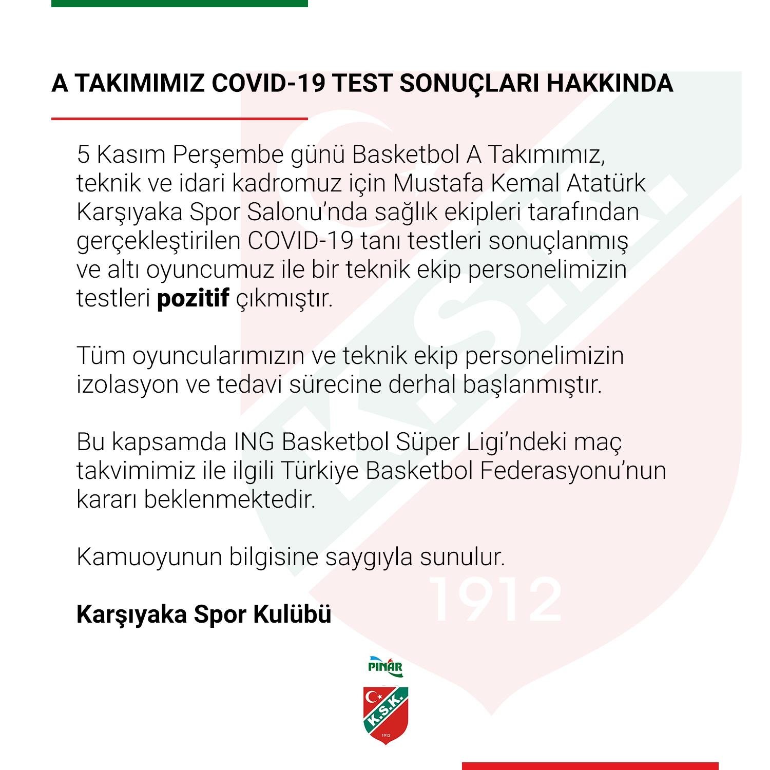 ING Basketbol Muhteşem Ligi takımlarından Pınar Karşıyaka, 6 oyuncu ve 1 çalışanın yeni tip corona virüsü testinin olumlu çıktığını açıkladı.