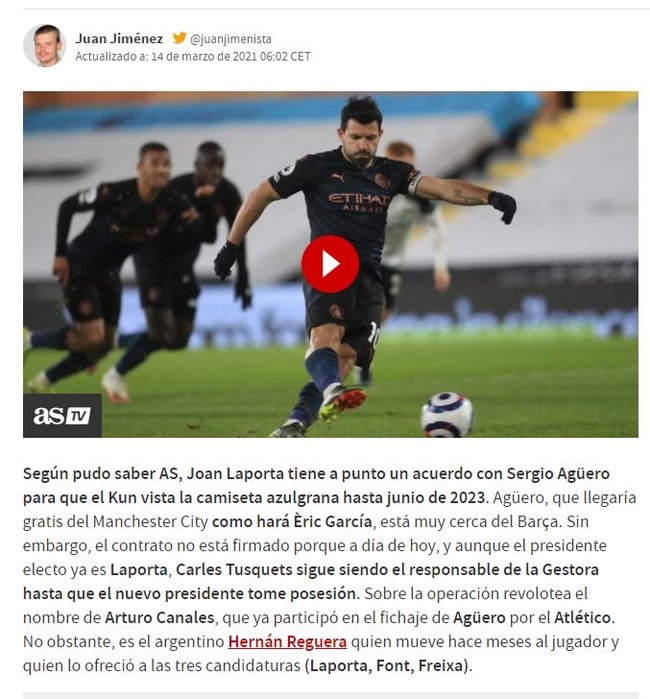 Barcelona, Lider Joan Laporta’nın çok istediği Sergio Aguero transferine çok yakın. İspanyol medyası As’ın haberine nazaran Barcelona Lideri Joan Laporta, Arjantinli golcü futbolcuyla muahede sağladı.