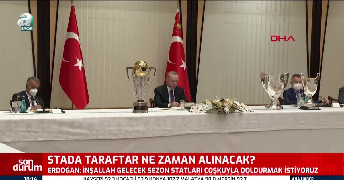Erdoğan, “İnşallah önümüzdeki dönemi tüm futbolseverlerin stadyumları yine coşkuyla doldurduğu bir iklimde düzenlemek istiyoruz.” tabirlerini kullandı.