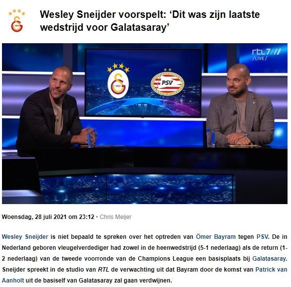 Galatasaray, Şampiyonlar Ligi 2. ön eleme tipinde birinci maçta 5-1 kaybettiği PSV Eindhoven’a karşı alanında rövanş müsabakası oynadı. Bu çabadan de 2-1 mağlup ayrılan sarı-kırmızılı takımın Devler Ligi macerası kısa sürdü. Maçı yorumlayan isimlerden biri de Galatasaray’ın eski yıldızı Wesley Sneijder’di. Hollanda basınından RTL’de müsabakayı kıymetlendiren Sneijder, Ömer Bayram’ın performansını eleştirdi.