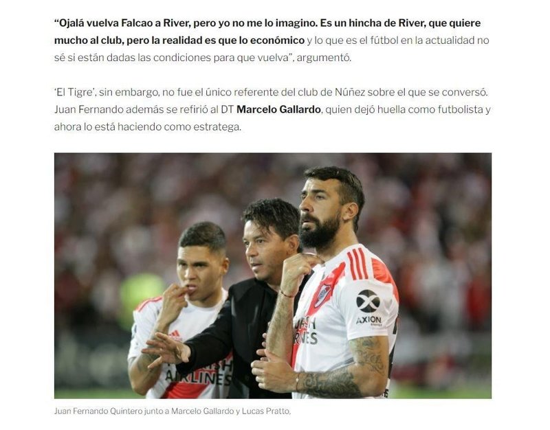 Öte yandan Galatasaray’ın geçtiğimiz iki dönemde sakatlıklarla boğuşan ve beklentilerin uzağında kalan Radamel Falcao’nun geleceğine dair de konuşan 28 yaşındaki 10 numara, “Umuyorum ki Falcao River Plate’e döner fakat bunu hayal edemiyorum. O, bir River hayranı. Kulübü de çok seviyor lakin bir ekonomik gerçeklik de var. Onu geri döndürecek şartlar oluşur mu bilmiyorum” dedi.