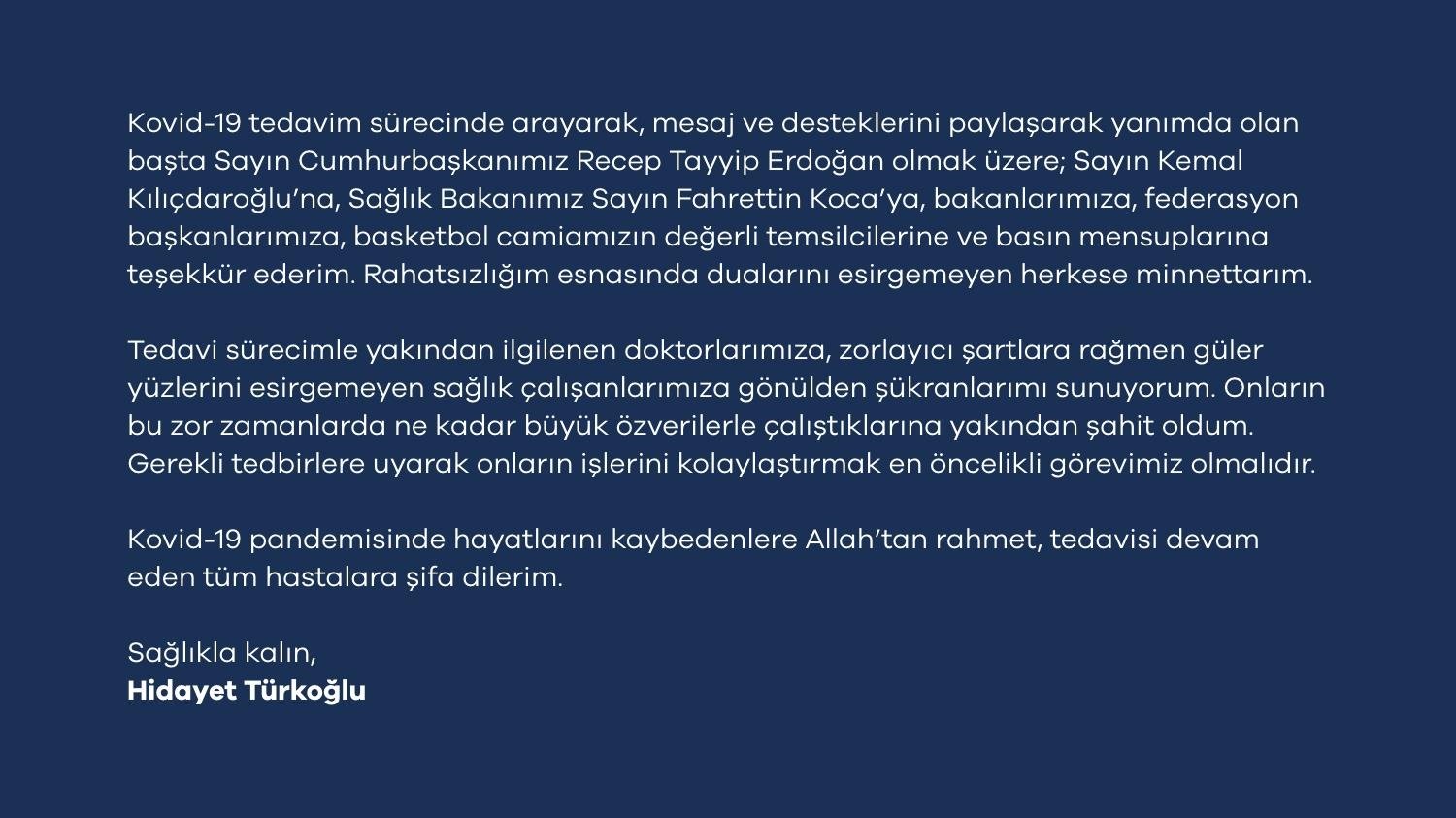 “Kovid-19 tedavim sürecinde arayarak, ileti ve dayanaklarını paylaşarak yanımda olan başta Cumhurbaşkanımız Recep Tayyip Erdoğan olmak üzere; Kemal Kılıçdaroğlu’na, Sıhhat Bakanımız Fahrettin Koca’ya, bakanlarımıza, federasyon liderlerimize, basketbol topluluğumuzun pahalı temsilcilerine ve basın mensuplarına teşekkür ederim. Rahatsızlığım esnasında dualarını esirgemeyen herkese minnettarım.