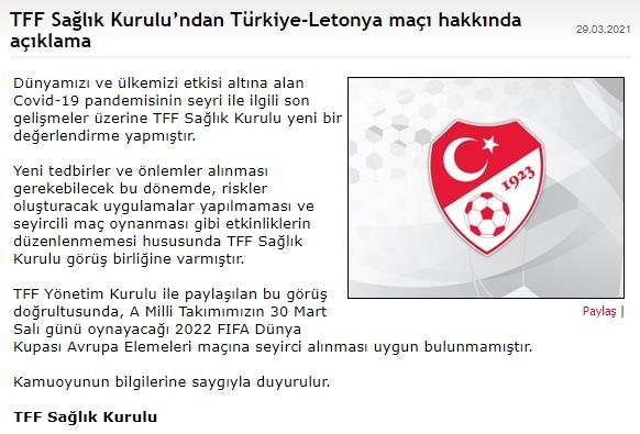 TFF İdare Heyeti ile paylaşılan bu görüş doğrultusunda, A Ulusal Grubumuzun 30 Mart Salı günü oynayacağı 2022 FIFA Dünya Kupası Avrupa Elemeleri maçına seyirci alınması uygun bulunmamıştır.