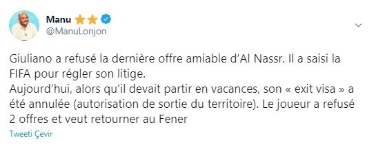 Öte yandan Giuliano’nun kulübüyle yapacağı müzakereler sonrasında mukavelesini feshetmek istediği bilinirken, Fenerbahçe’de yine forma giymek istediği aktarıldı.