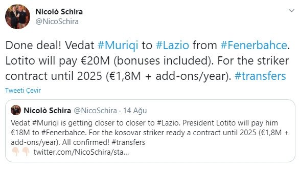 Bu transferde sarı lacivertlilerin Lazio’dan bonuslar dahil olmak üzere 20 milyon euro alacağı aktarılırken, Muriqi’nin 2025 yılında dek sözleşme imzalayacağı ifade edildi.