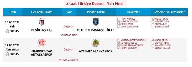TFF’nin resmi internet sitesinden alınan bilgilere nazaran; Ziraat Türkiye Kupası’nda yarı finalde oynanacak Beşiktaş-Başakşehir ile Antalyaspor-Alanyaspor maçlarının hakemleri belirli oldu.